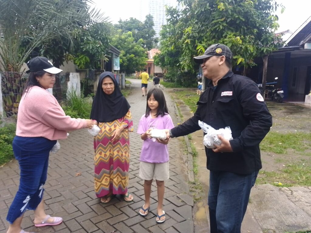Tangerang | Meski diguyur gerimis, Kasie Sosial FWJI Tangkot, Ali Jaya, bersama pengurus Sri Nurhaeni tetap semangat melaksanakan program Jumat Berkah, Jumat (23/5/2025) pukul 14.00 WIB. Kegiatan yang digelar di depan kantor FWJI Tangkot, Jl. Bunga Mekar, Kunciran Jaya, Pinang, Kota Tangerang ini mendapat antusiasme tinggi dari masyarakat, mulai anak-anak hingga orang dewasa.